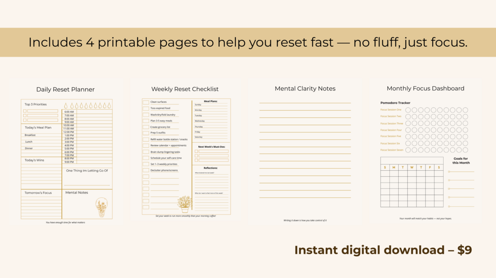 Feeling scattered, stuck, or simply stretched too thin? Reset & Refocus is your no-fluff, done-for-you daily planner designed to bring structure, clarity, and calm back into your life. Whether you're juggling work, goals, or just need space to breathe, this minimalist bundle helps you reset your mind and refocus your day with intention.